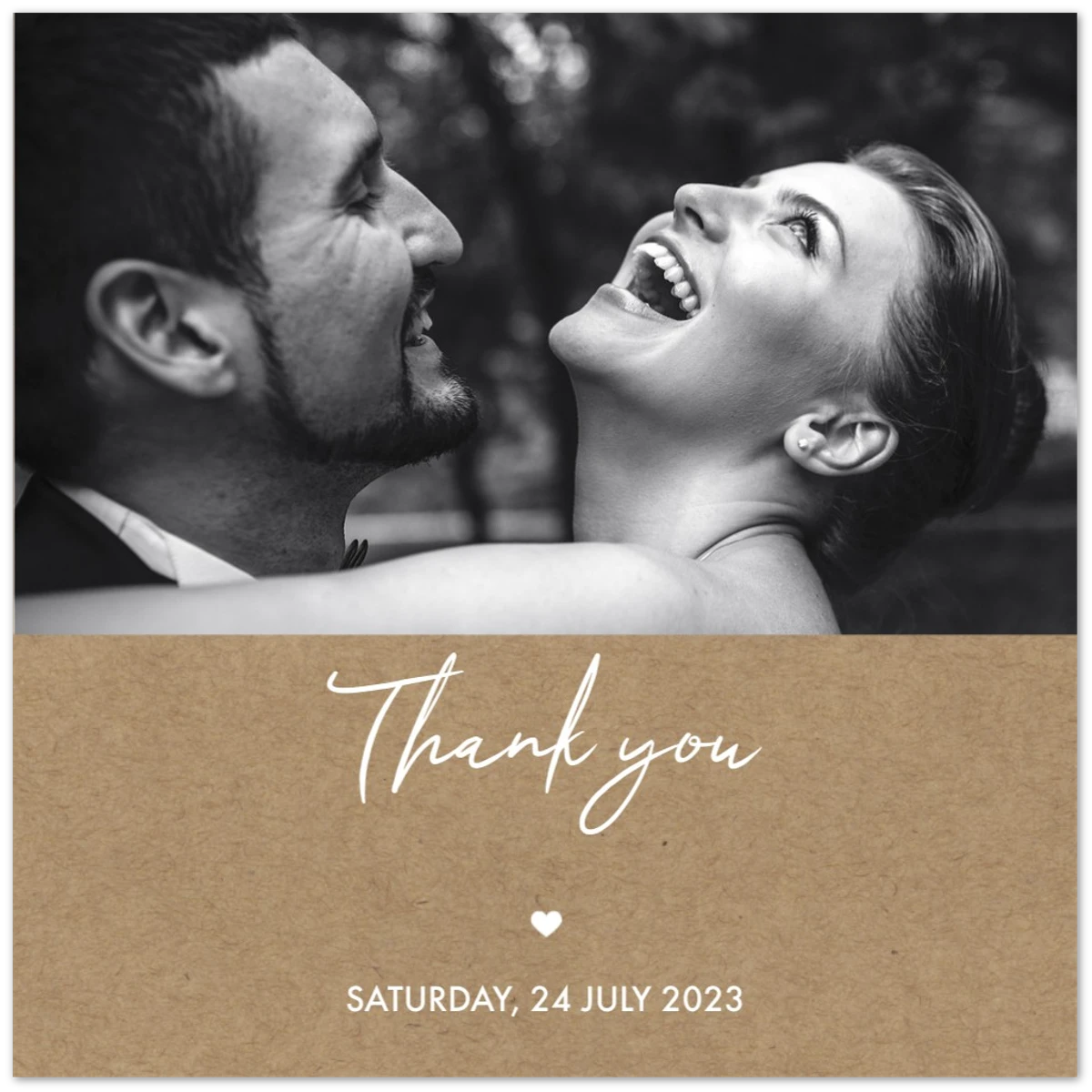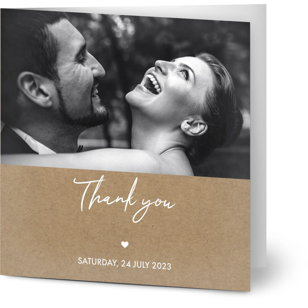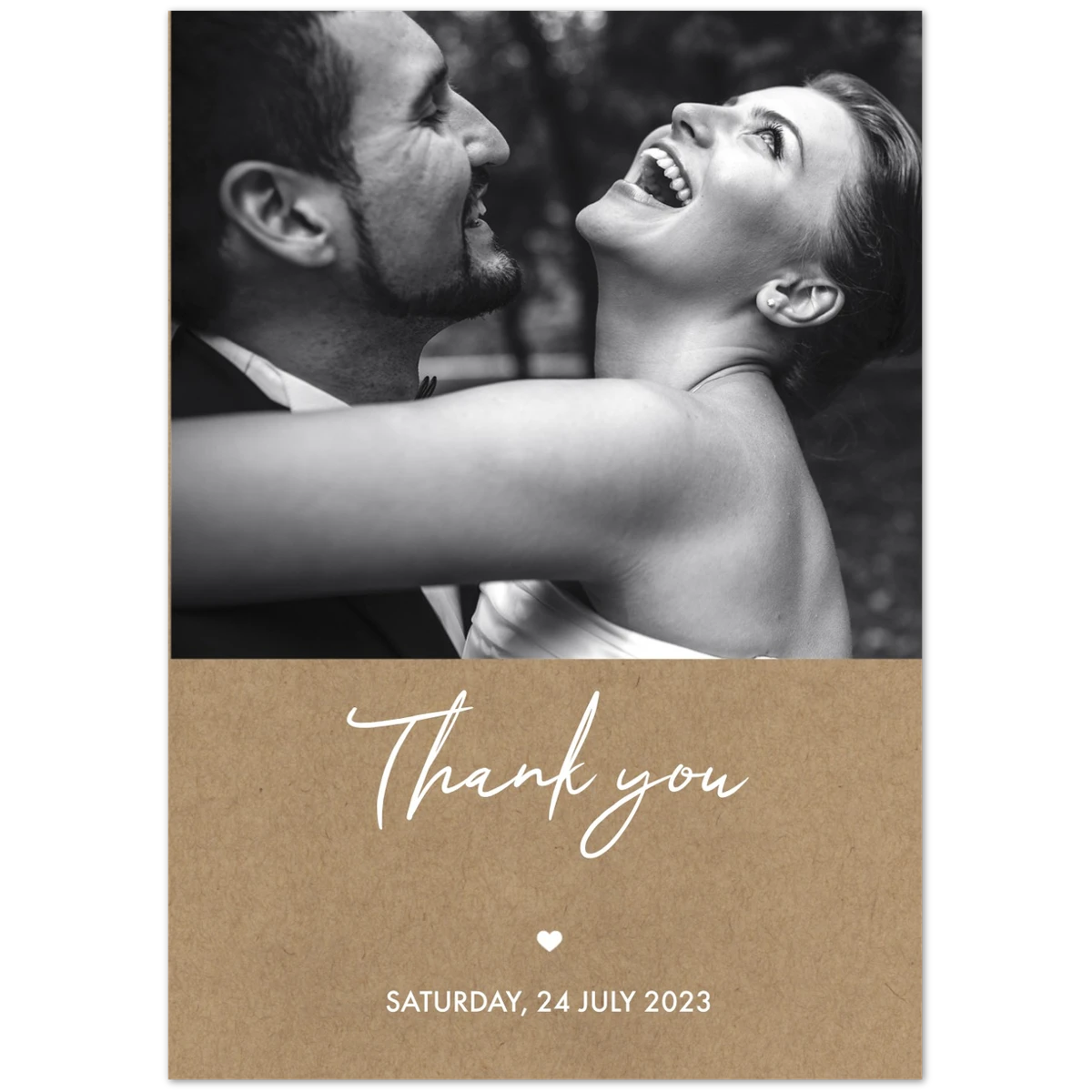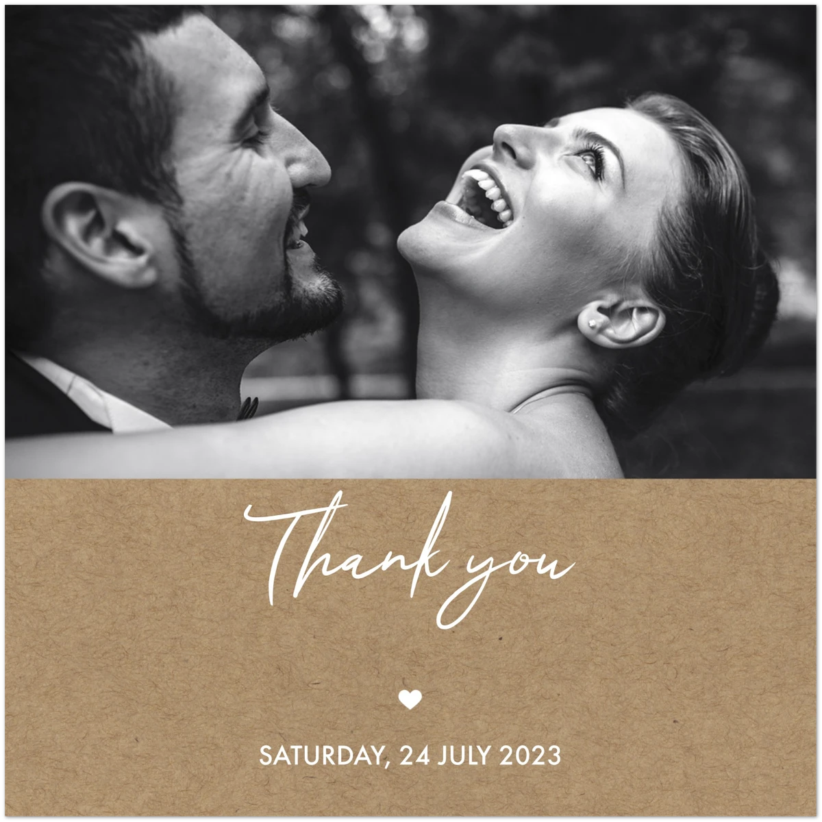 Kraft Echoes Bliss evokes a sense of heartfelt sincerity with its natural kraft paper backdrop. The black and white photograph captures a candid moment of joy, making this card perfect for expressing deep appreciation and memorable thanks.