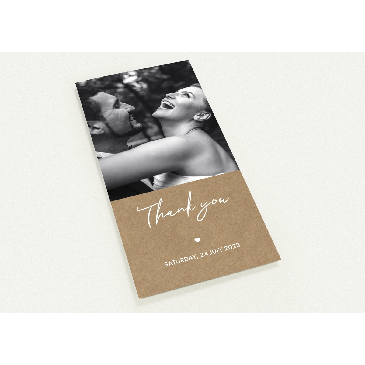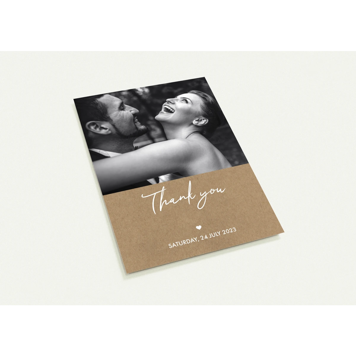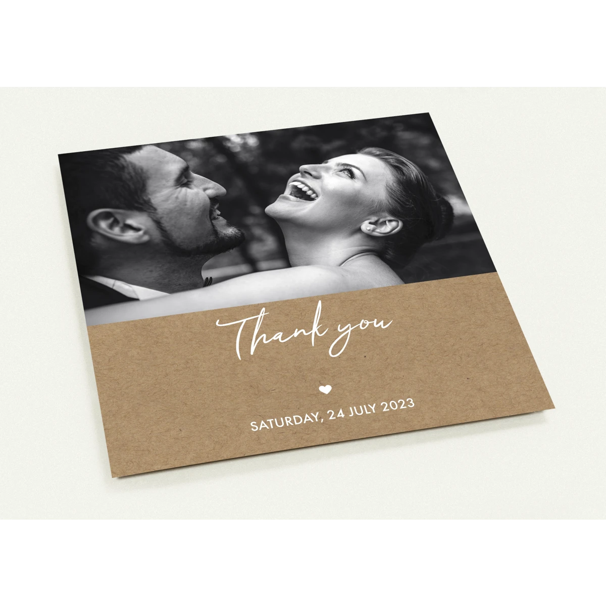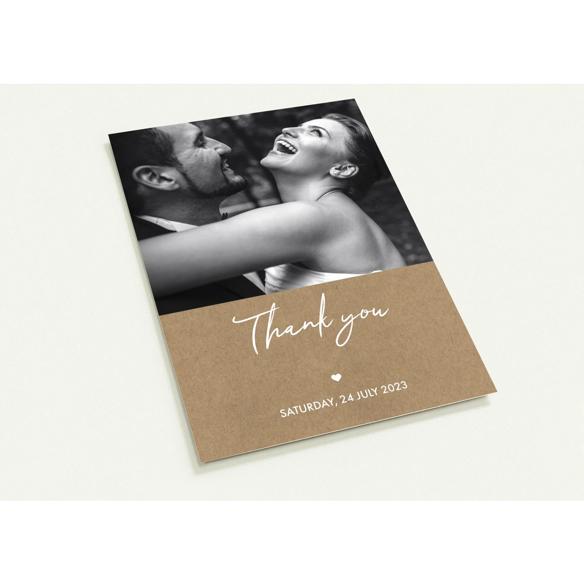 Kraft Echoes Bliss evokes a sense of heartfelt sincerity with its natural kraft paper backdrop. The black and white photograph captures a candid moment of joy, making this card perfect for expressing deep appreciation and memorable thanks.