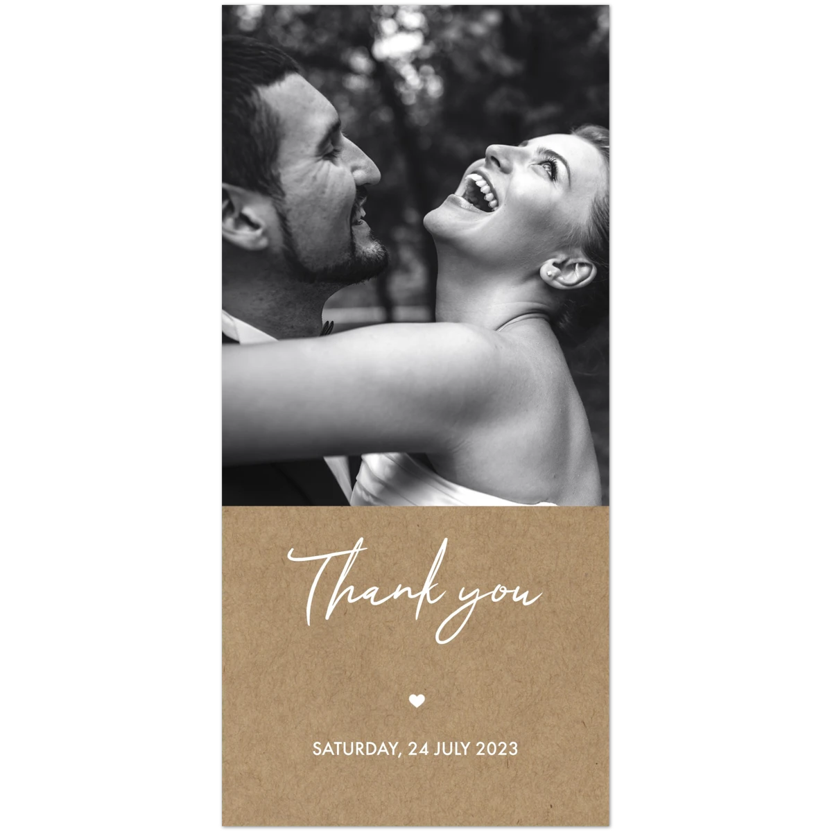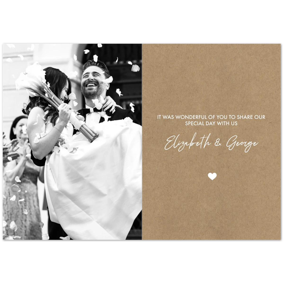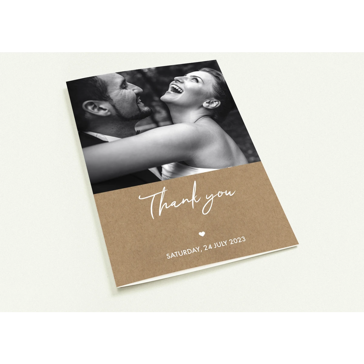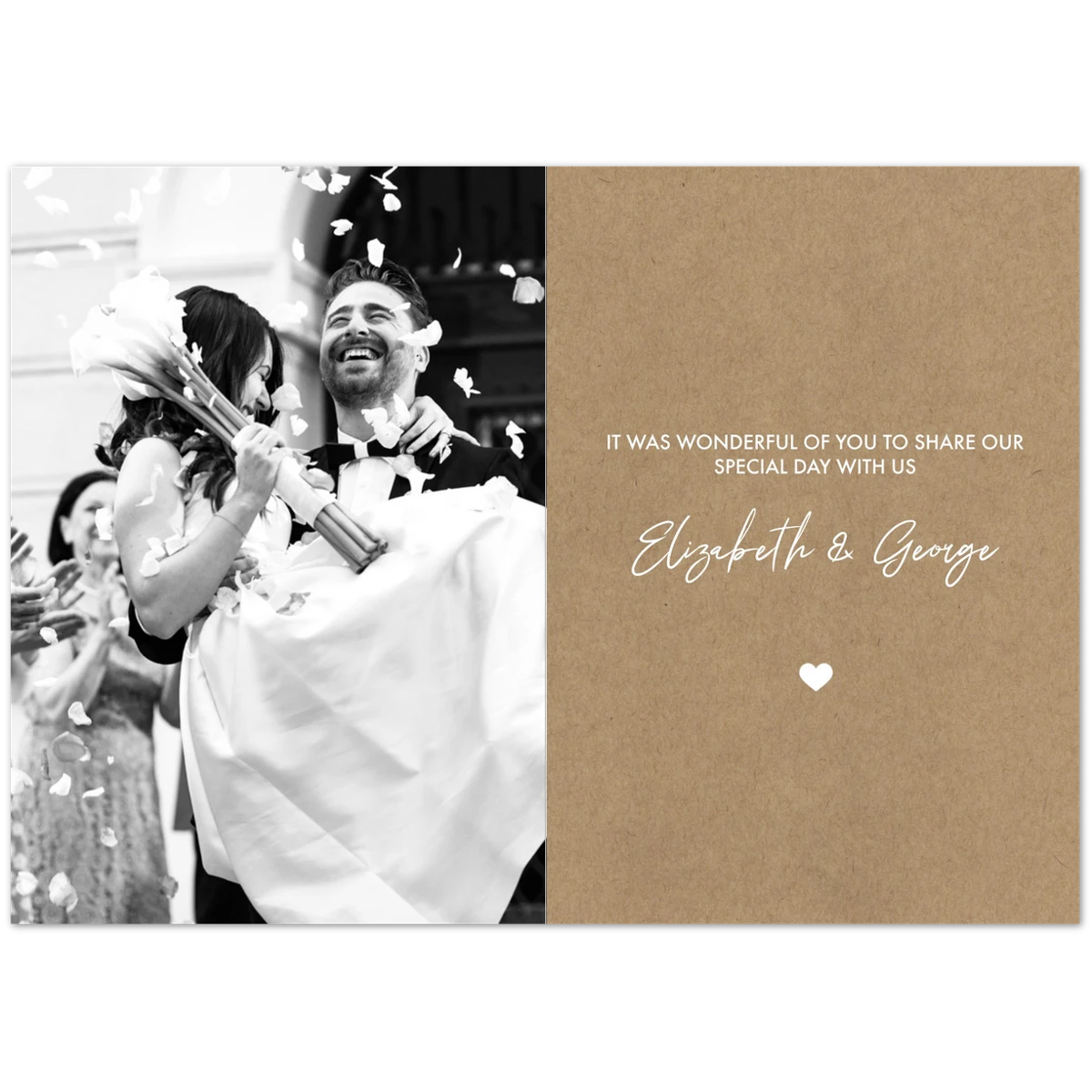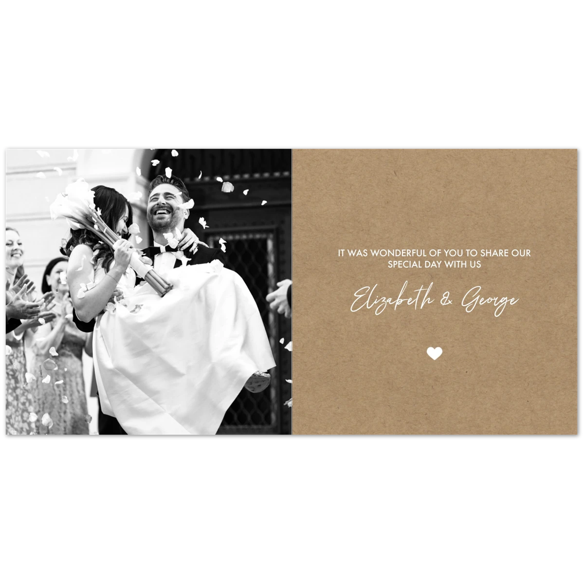 Kraft Echoes Bliss evokes a sense of heartfelt sincerity with its natural kraft paper backdrop. The black and white photograph captures a candid moment of joy, making this card perfect for expressing deep appreciation and memorable thanks.