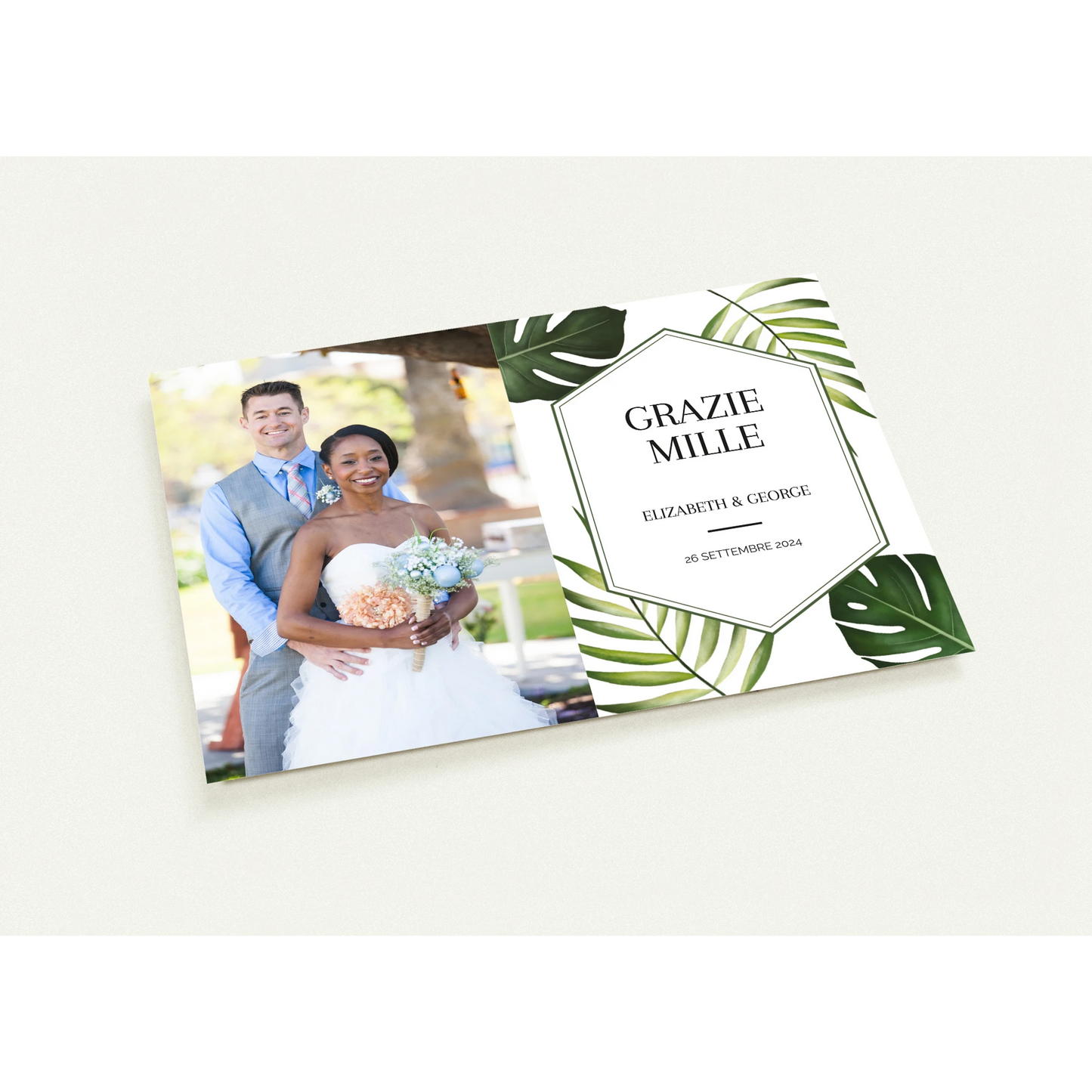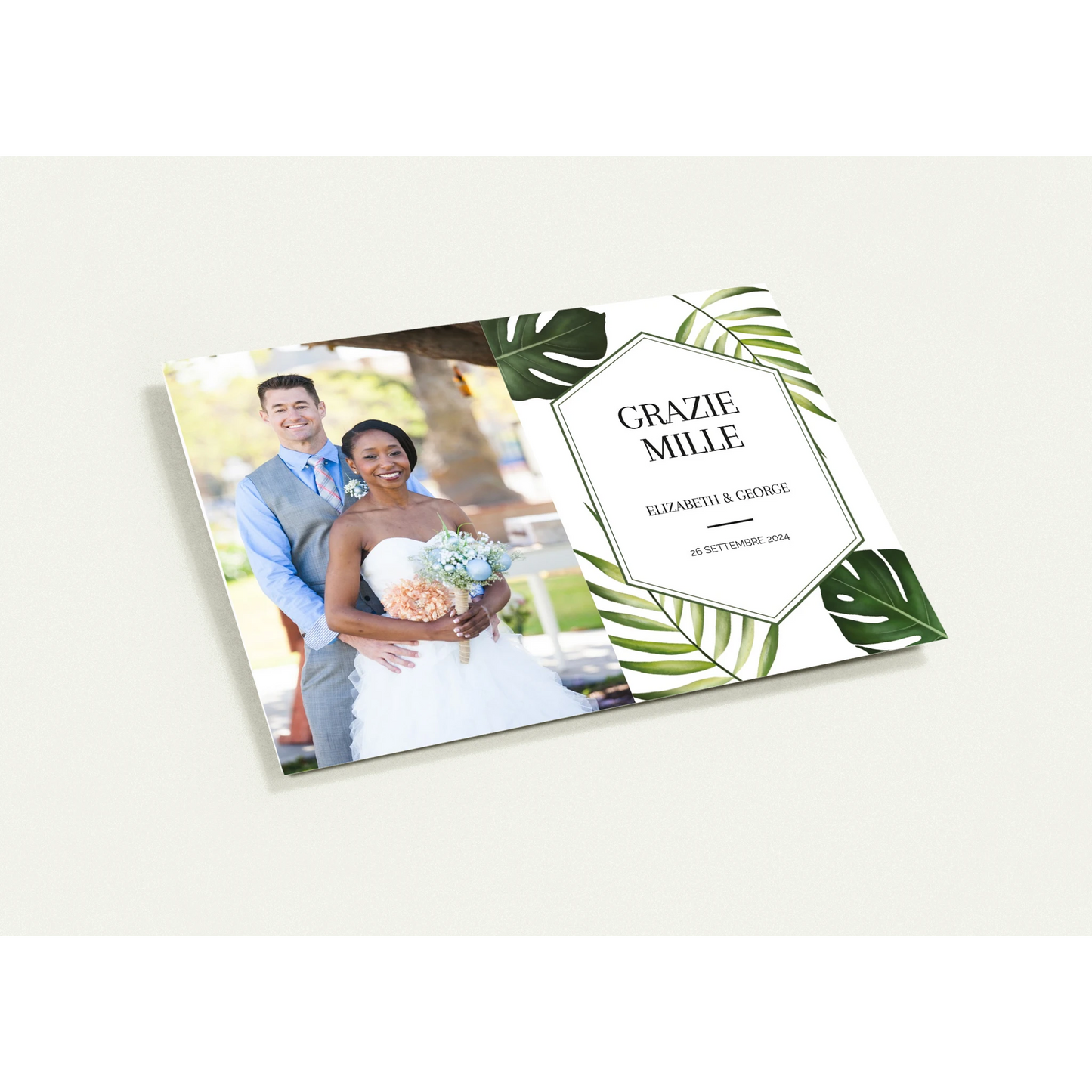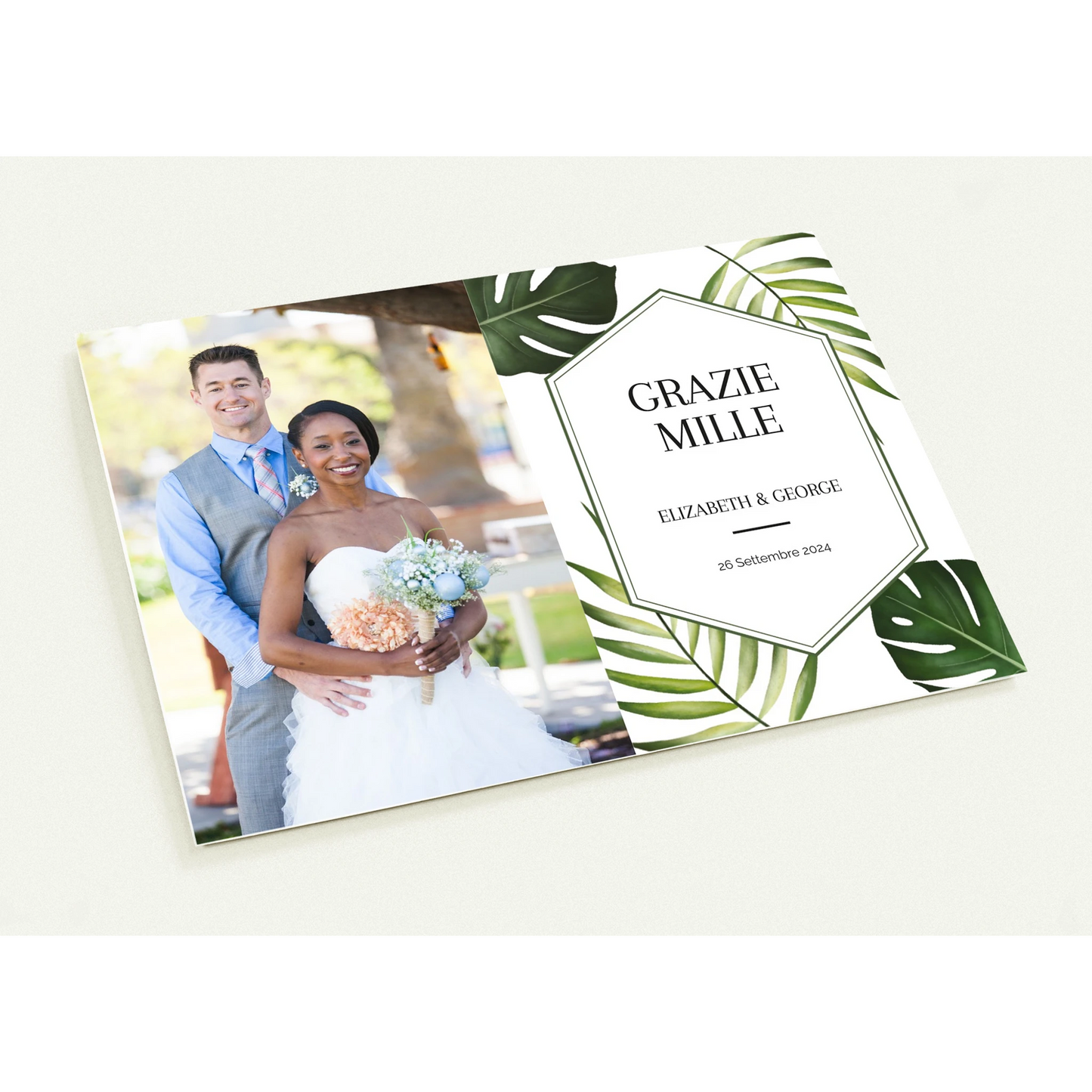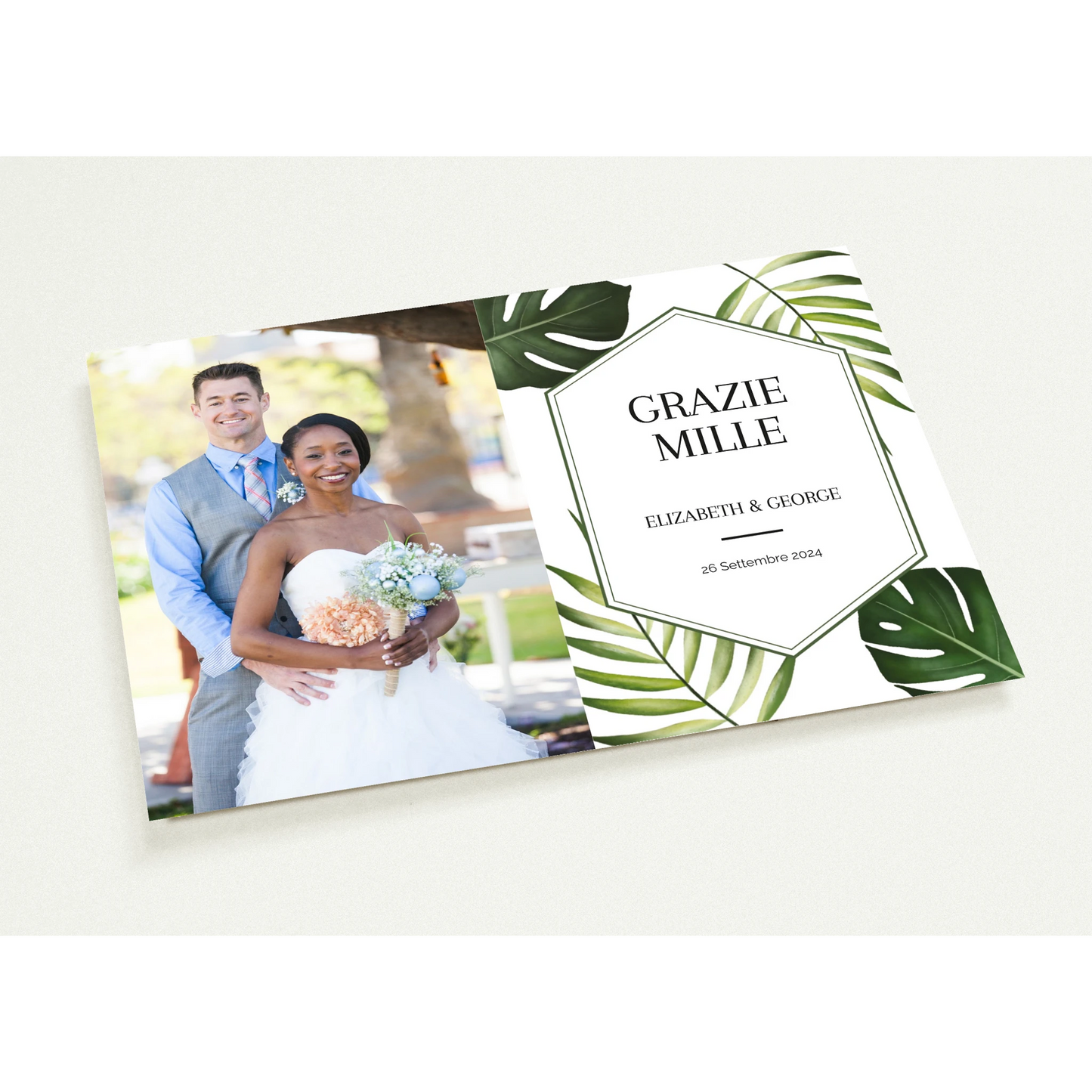 Monstera Serenity Thanks features the tranquil charm of lush monstera leaves wrapped around the joyous portrait of a newly married couple, symbolizing the heartfelt gratitude flourishing from their union.