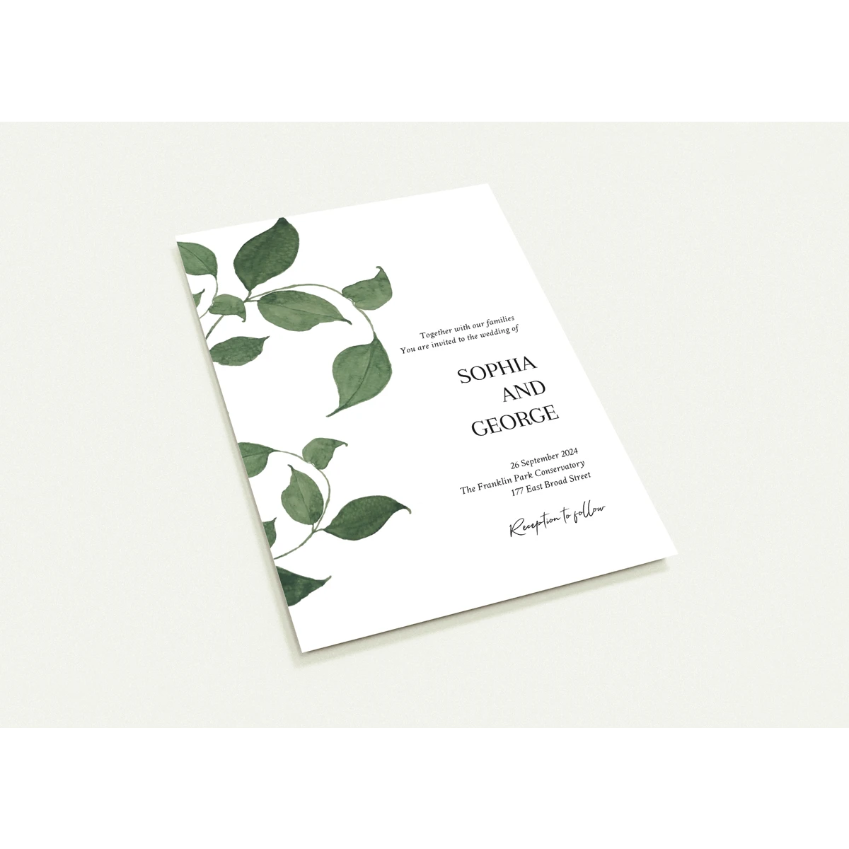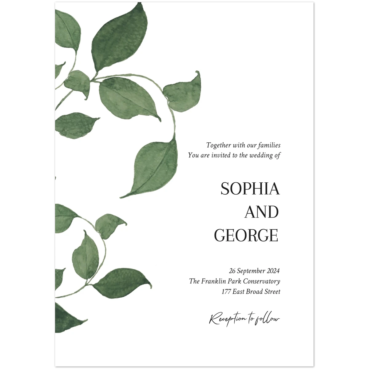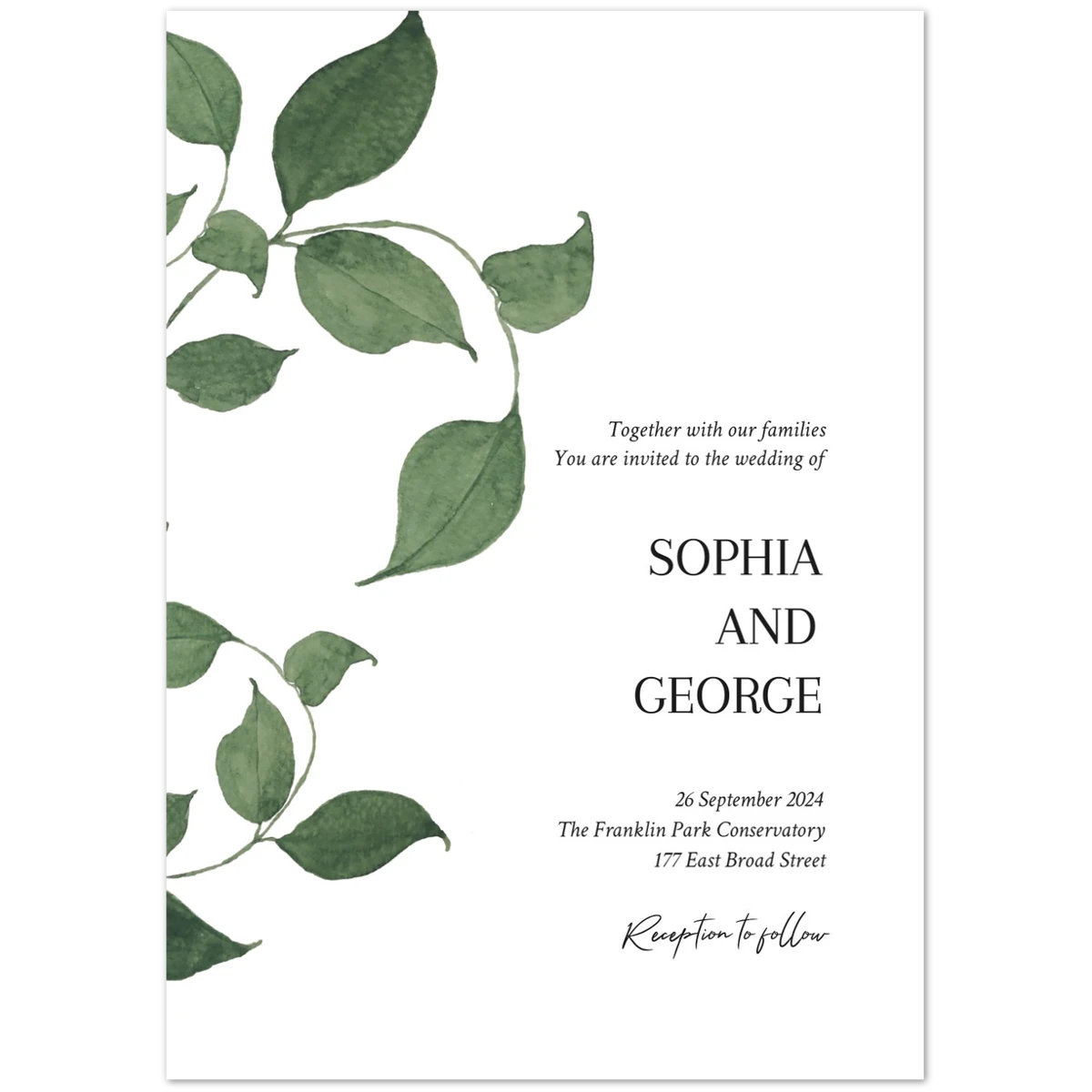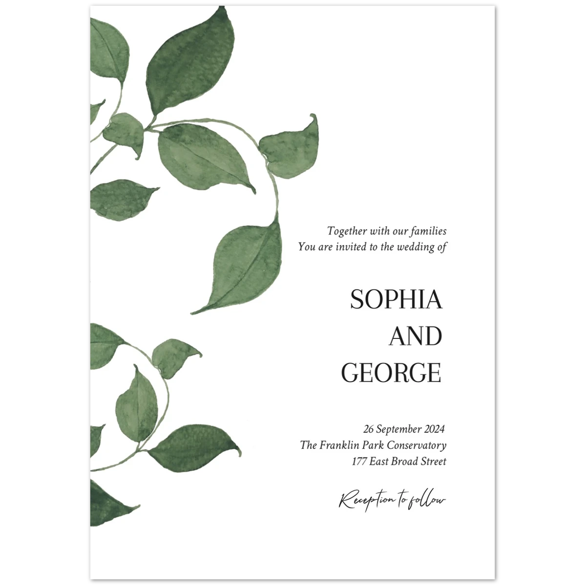 Features a delicate overlay of green foliage, gently framing the serene announcement of a cherished future event. This design conveys a natural elegance and an invitation to join in a celebration rooted in simplicity and organic beauty.