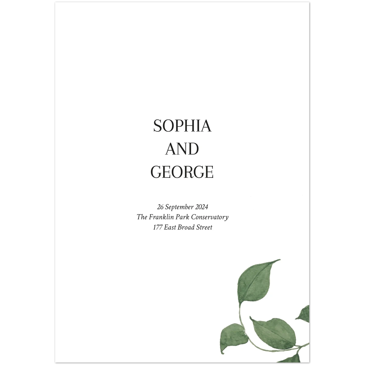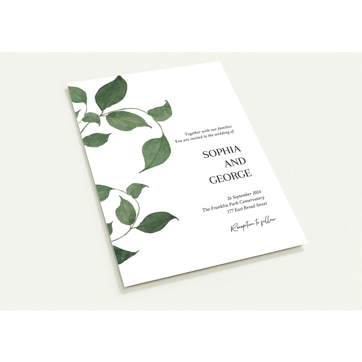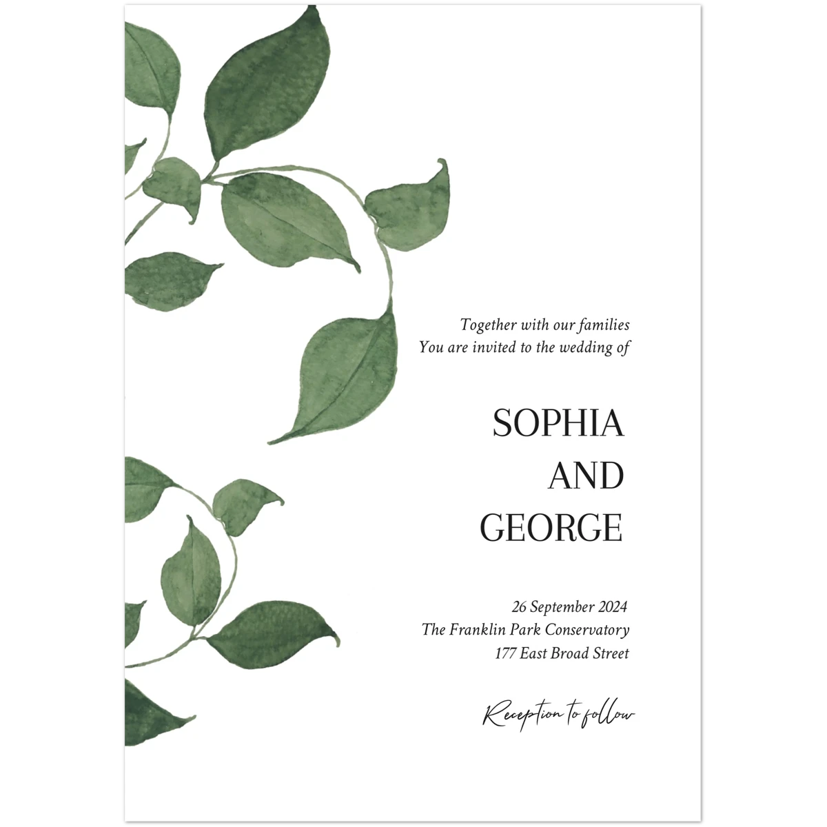 Features a delicate overlay of green foliage, gently framing the serene announcement of a cherished future event. This design conveys a natural elegance and an invitation to join in a celebration rooted in simplicity and organic beauty.