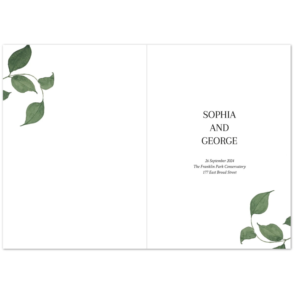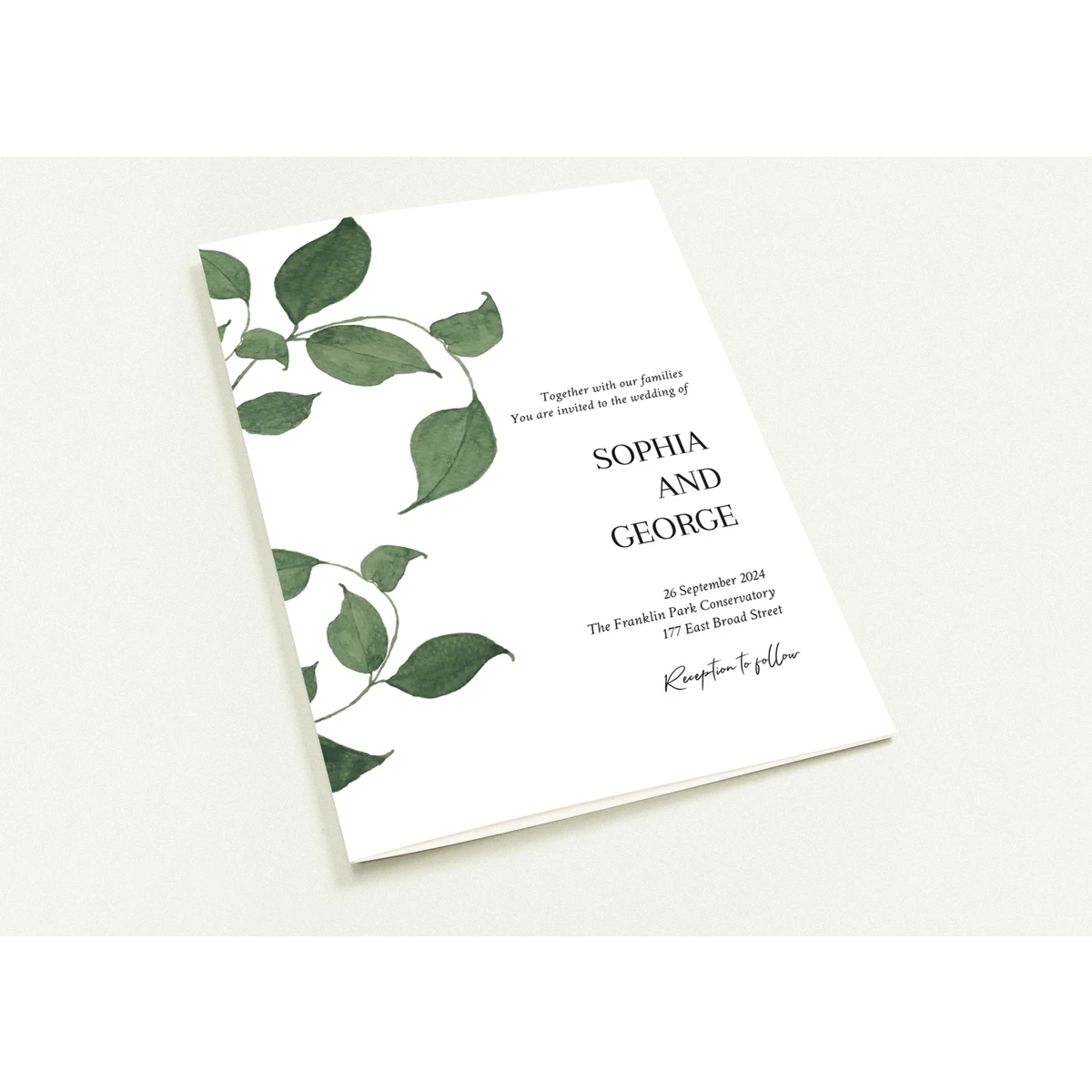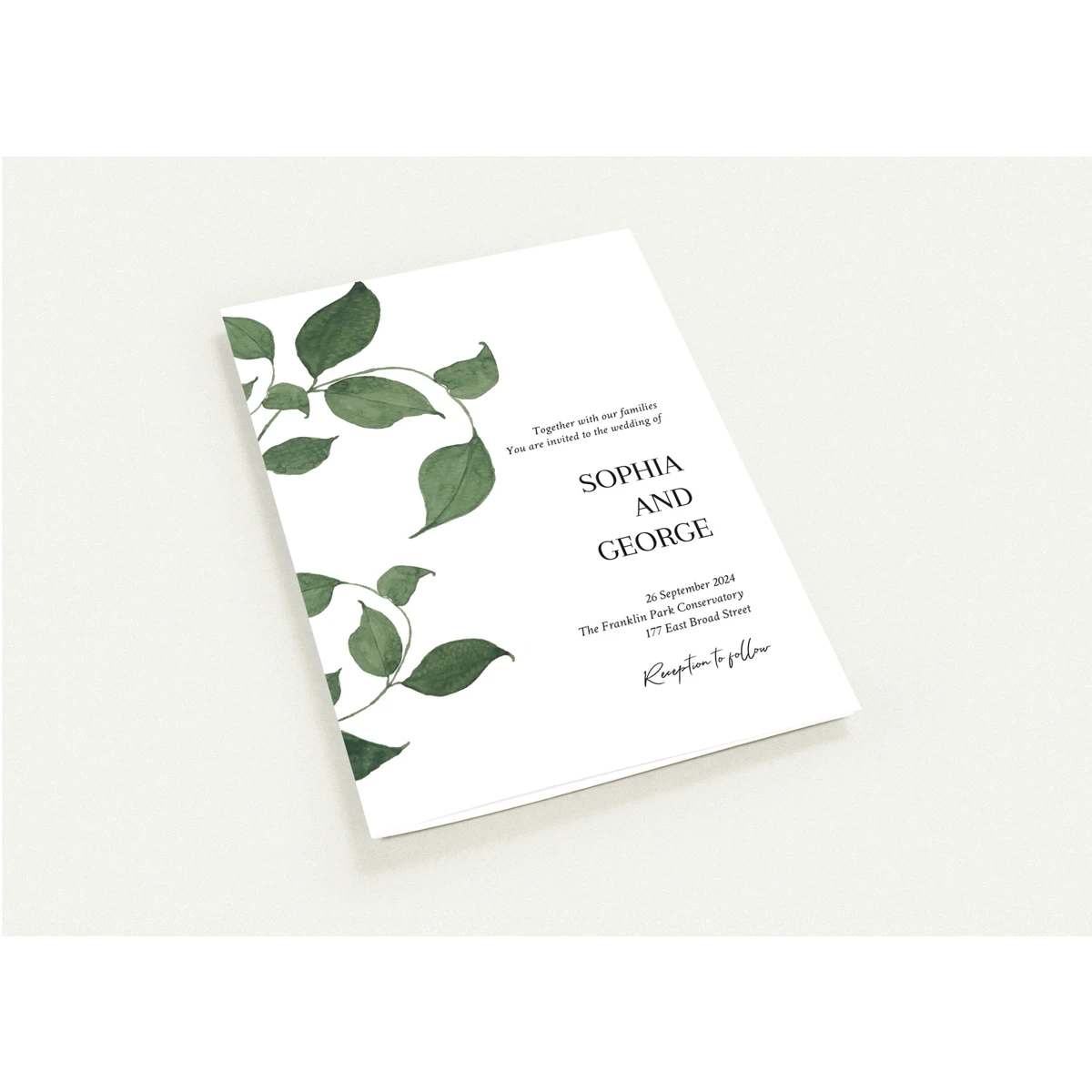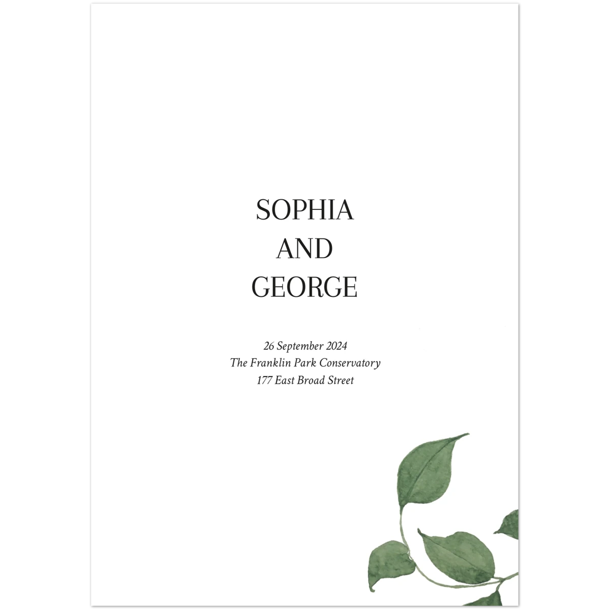Features a delicate overlay of green foliage, gently framing the serene announcement of a cherished future event. This design conveys a natural elegance and an invitation to join in a celebration rooted in simplicity and organic beauty.