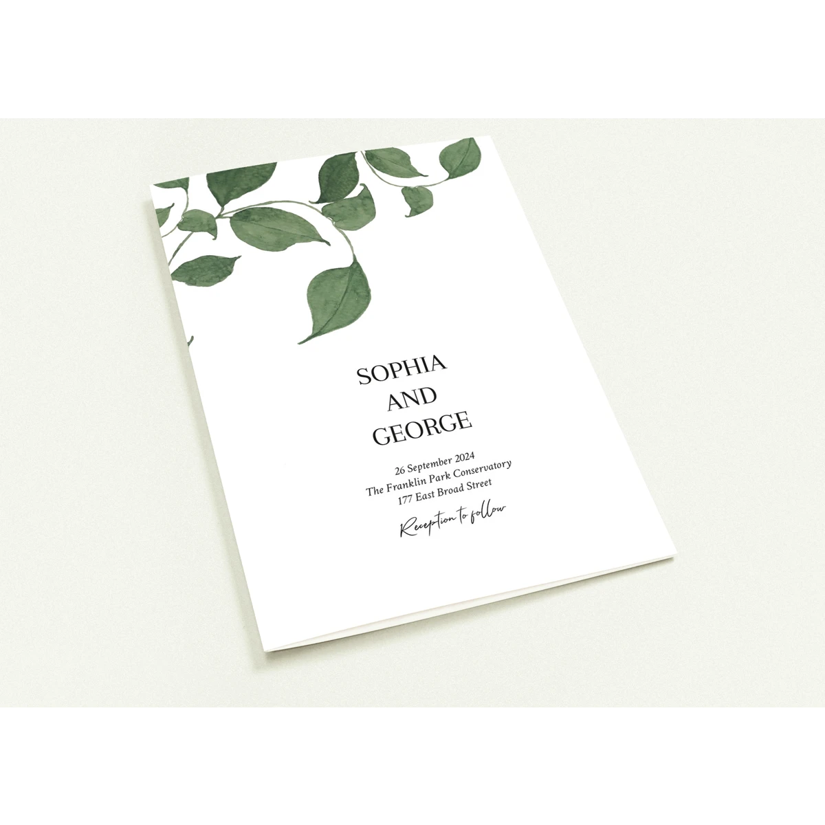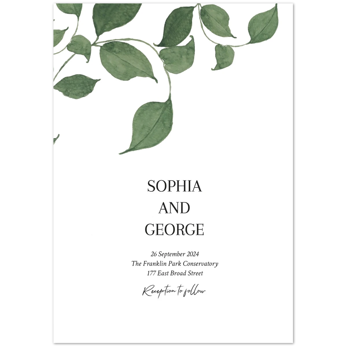 Features a delicate overlay of green foliage, gently framing the serene announcement of a cherished future event. This design conveys a natural elegance and an invitation to join in a celebration rooted in simplicity and organic beauty.